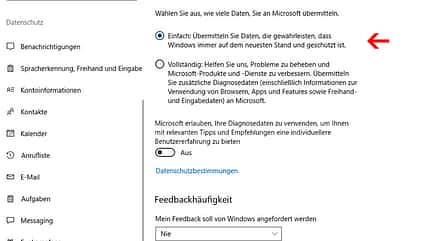 Zwar hat sich Microsofts Interesse an Ihrem Nutzungsverhalten mit Windows 10 stark erhöht, allerdings bietet das Betriebssystem in den Einstellungen unter "Datenschutz" auch übersichtlich und gebündelt die Möglichkeit, die Zugriffs- und Nutzungsrechte Ihrer Daten klar zu definieren. Wenn Sie keine der aufgeführten Apps nutzen, können Sie ihnen sämtliche Berechtigungen getrost entziehen. Im Unterpunkt "Allgemein" können Sie zudem Microsoft verbieten, eine Werbe-ID über Sie anzulegen. Das verhindert beispielsweise, dass Sie über mehrere Apps hinweg für Werbe-Anbieter identifiziert werden können. Auch ist es ratsam, unter dem Punkt "Feedback und Diagnose" die übermittelten Diagnose- und Nutzungsdaten auf "Einfach" zu stellen (siehe Bild), um – unter anderem – zu verhindern, dass Microsoft auch die gesammelten Daten Ihres Browsers abgreift.