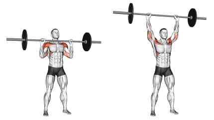 Überkopfdrücken ist eine mehrgelenkige Grundübung, die mehrere Muskelgruppen gleichzeitig aktiviert, egal ob mit Lang- oder Kurzhantel. Der Fokus liegt klar auf der Schulter, aber auch andere Bereiche arbeiten stark mit:
